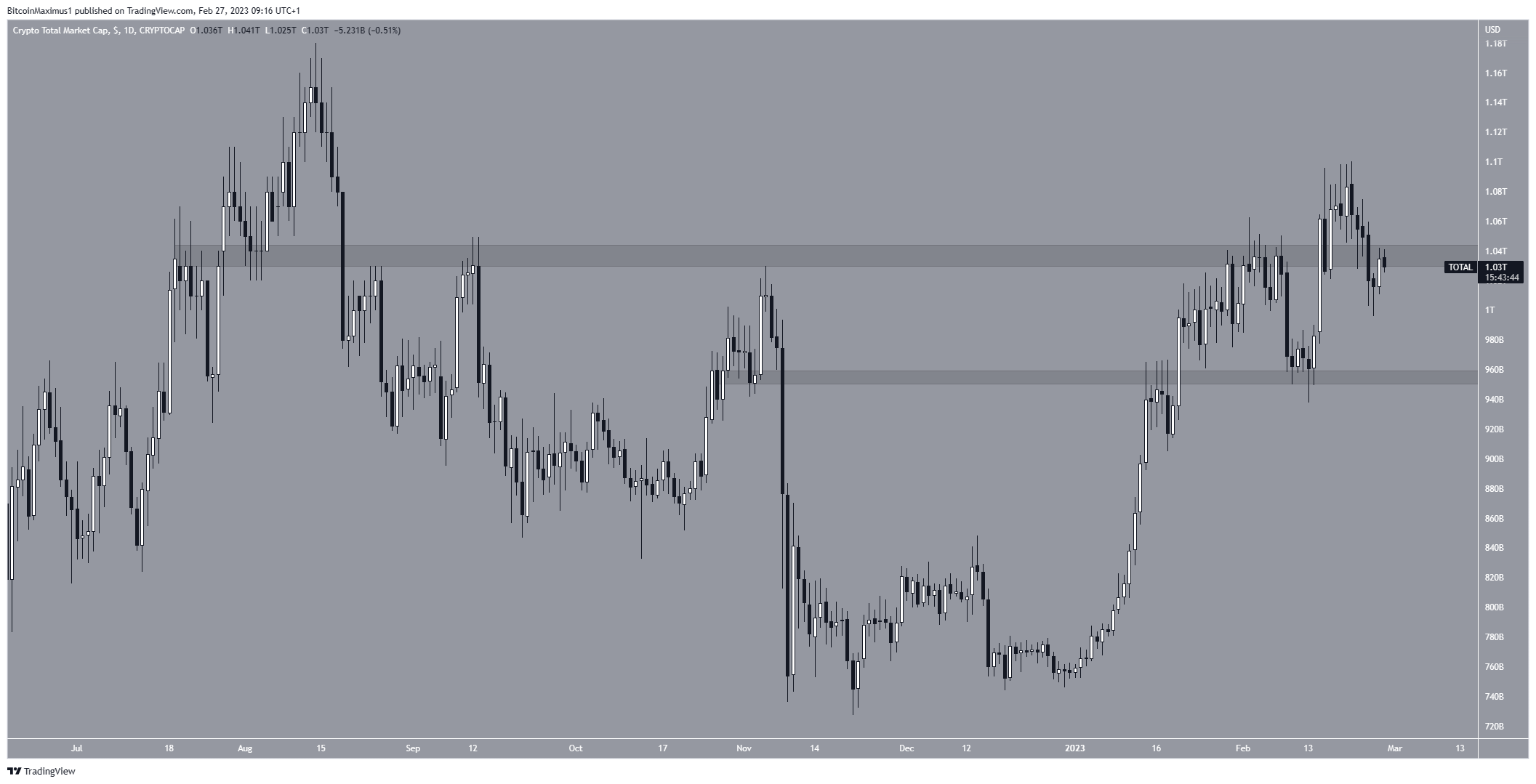 O valor total do mercado de criptomoedas está em baixa desde 21 de fevereiro, quando atingiu a máxima de US$ 1,10 trilhão. A mínima de US$ 996 bilhões foi atingida quatro dias depois.