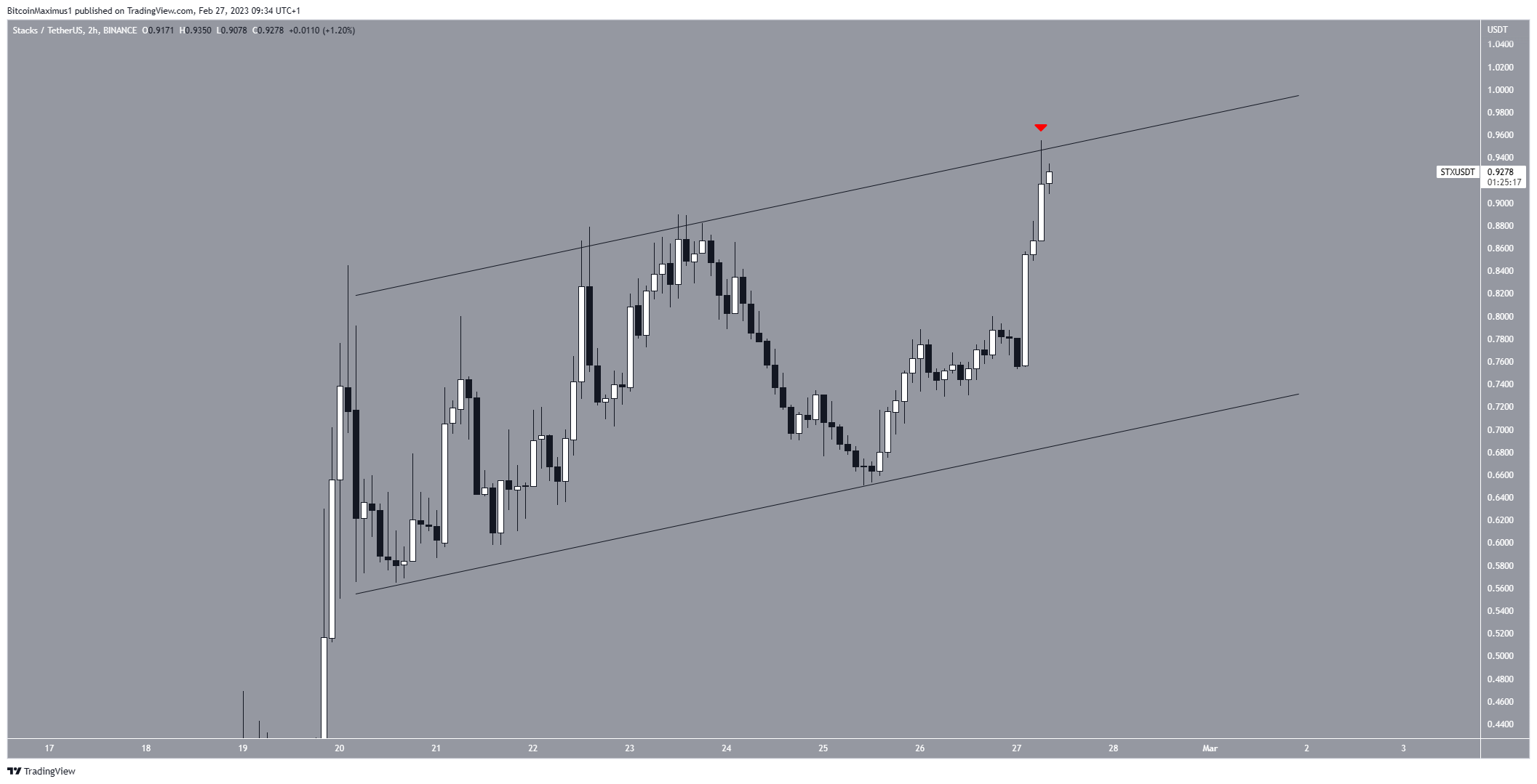 O preço do STX tem sido negociado dentro de um canal paralelo de alta desde 20 de fevereiro. Nesta segunda-feira (27), atingiu uma alta de US$ 0,87, validando a linha de resistência do canal (ícone vermelho).