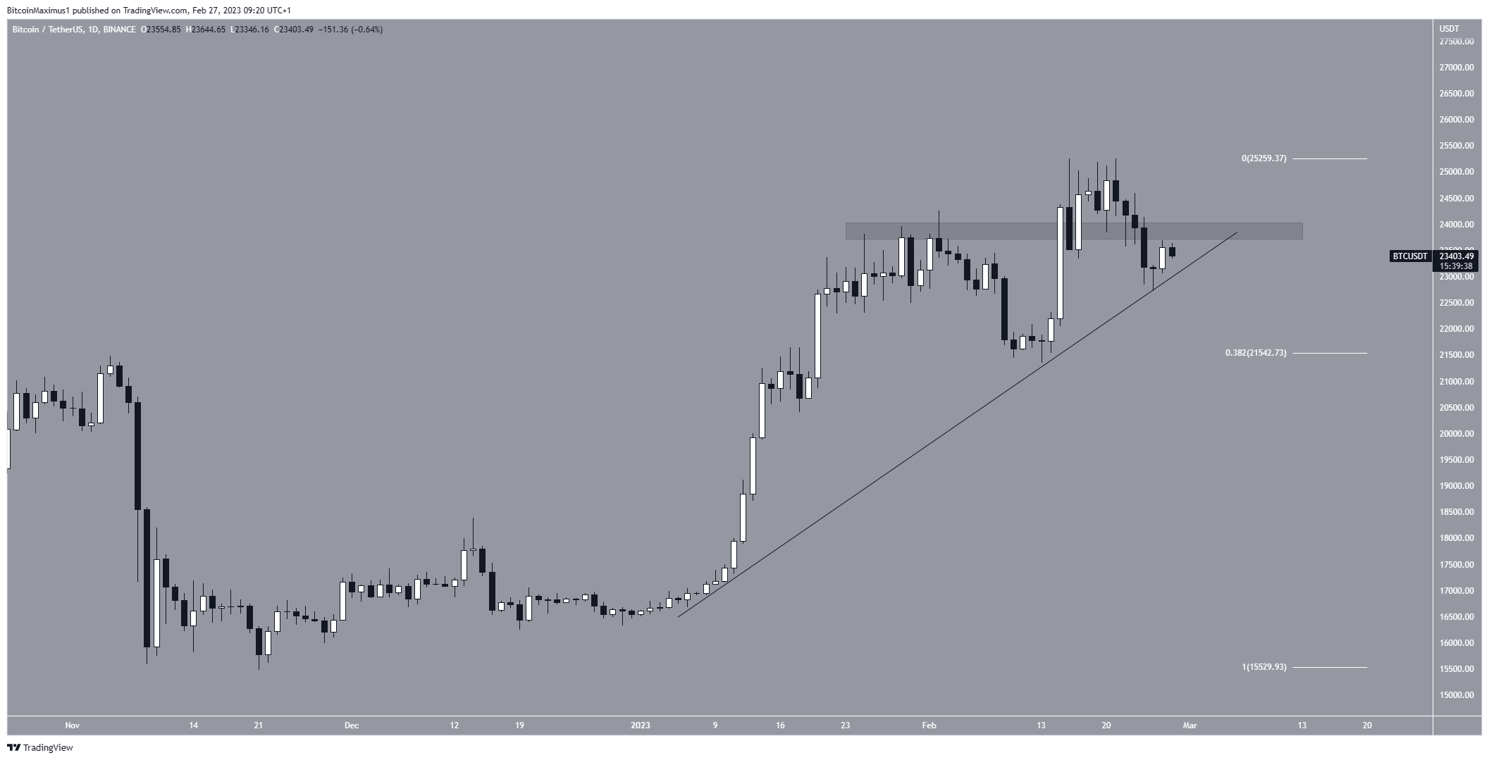 O preço do Bitcoin subiu ao lado de uma linha de tendência de alta desde o início do ano. Embora tenha atingido uma alta de US$ 25.250 em 16 de fevereiro, caiu abaixo da área de suporte horizontal de US$ 24.000 logo depois. Espera-se agora que a área forneça resistência.