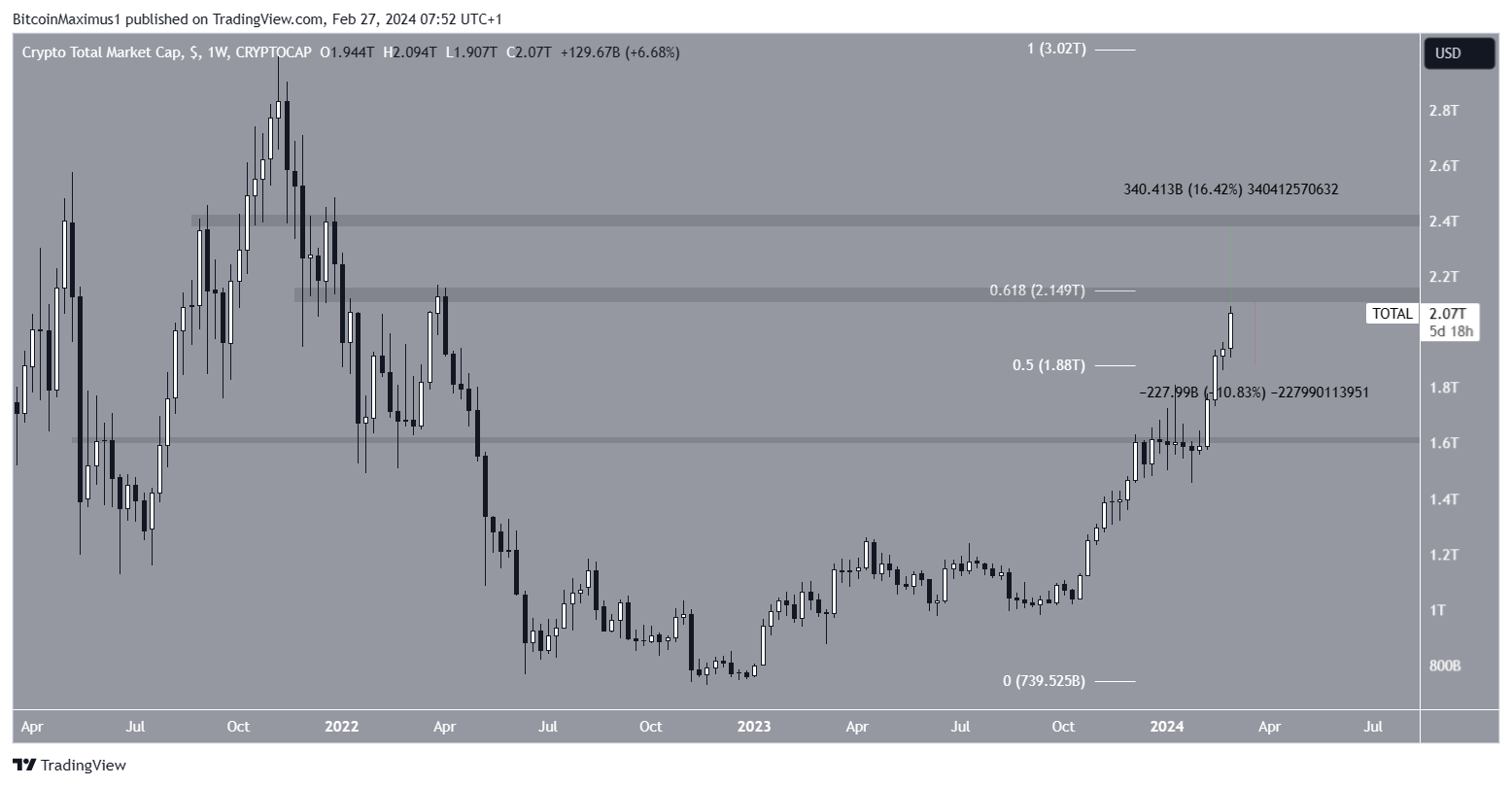 Apesar da previsão de alta, uma queda da área de resistência de US$ 2,15 trilhões pode desencadear uma queda de 11% para o nível de retração de 0,5 de Fibonacci, em US$ 1,88 trilhão.