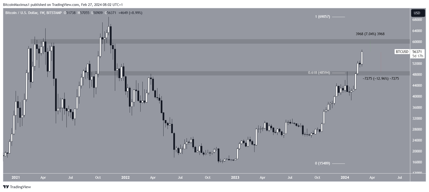 O Bitcoin está se aproximando da área de resistência horizontal de US$ 60.000, a última antes de um novo preço recorde. A área de resistência está 7% acima do preço atual.