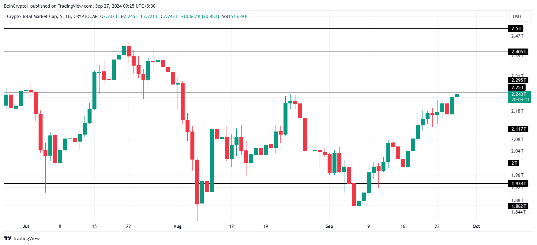 No entanto, se a TOTALCAP não conseguir romper a resistência, o mercado poderá enfrentar outro declínio. Em tal cenário, o preço pode cair novamente para testar o nível de suporte em US$ 2,11 trilhões. Uma falha em manter esse suporte pode levar a mais perdas, adicionando pressão ao mercado geral de criptomoedas.