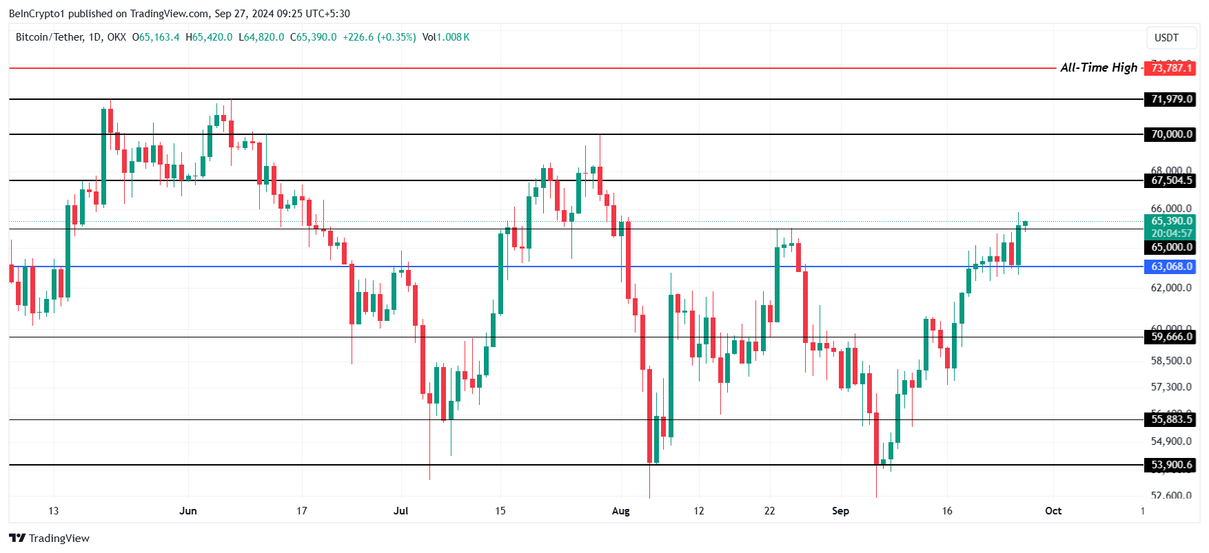 O Bitcoin rompeu e fechou acima da barreira crítica de US$ 65 mil com sucesso. Condições macroeconômicas otimistas e desenvolvimentos positivos recentes no espaço alimentaram esse aumento. O movimento acima desse nível-chave revigorou o otimismo do mercado, encorajando os detentores de Bitcoin a esperar mais ganhos no curto prazo.
