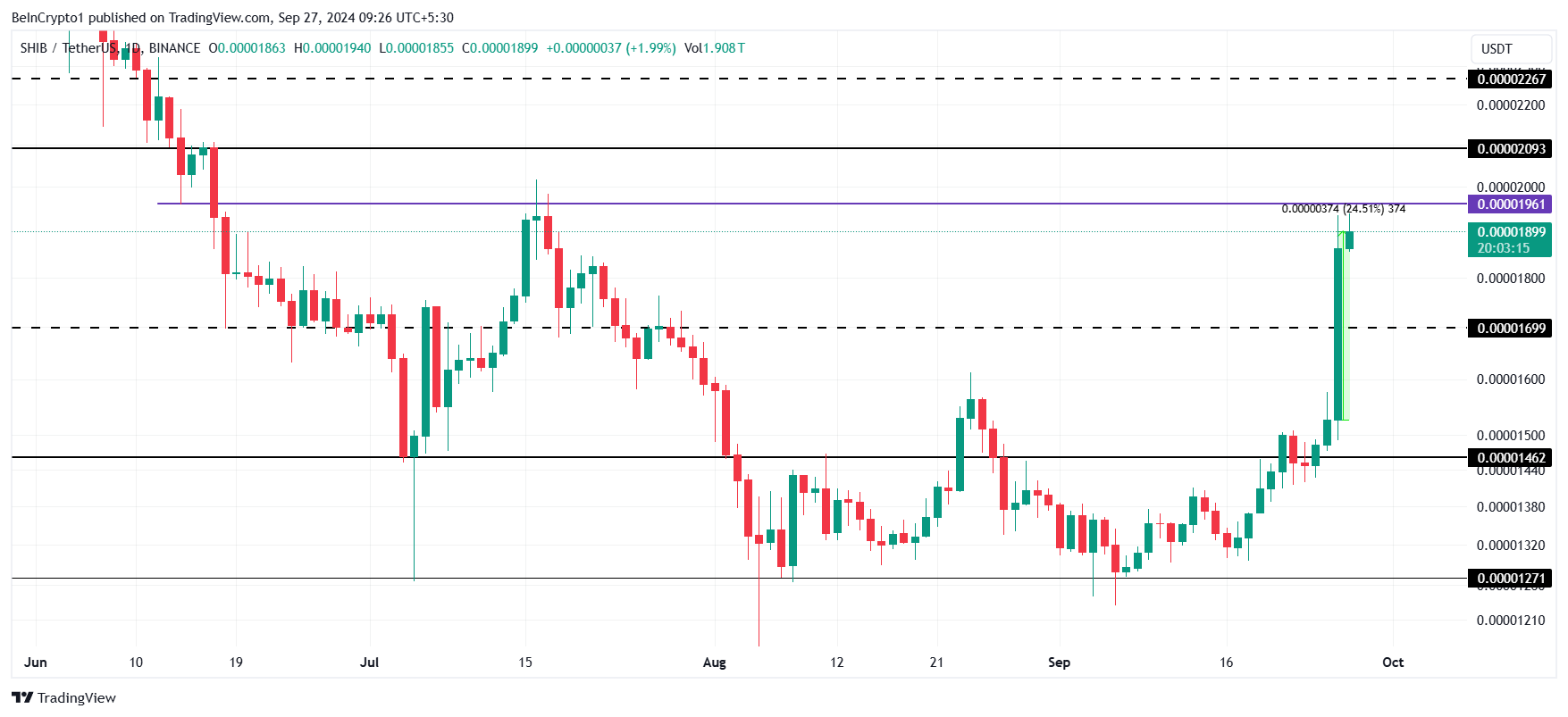 A SHIB subiu 24,5% em 24 horas, levando seu preço para US$ 0,00001899. A moeda meme agora está enfrentando resistência em US$ 0,00001961 e, se superar esse nível, pode subir além de US$ 0,00002000.