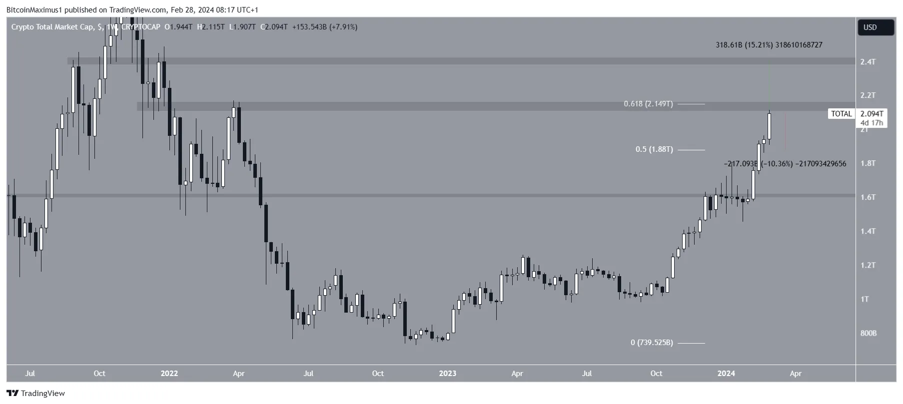Apesar da previsão de alta, uma rejeição da área de resistência de US$ 2,15 trilhões pode desencadear uma queda de 10% para o nível de retração de 0,5 de Fibonacci, em US$ 1,88 trilhão.