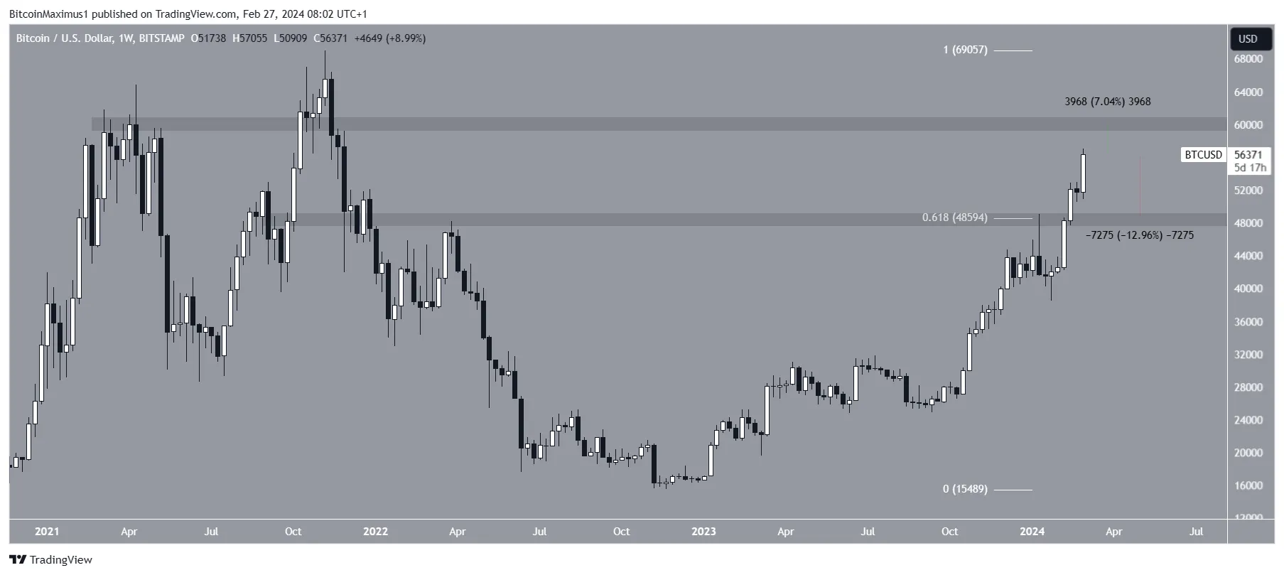 O Bitcoin está se aproximando da área de resistência horizontal de US$ 60.000, a última antes de sua máxima histórica em US$ 69.000. A área de resistência está 5% acima do preço atual.