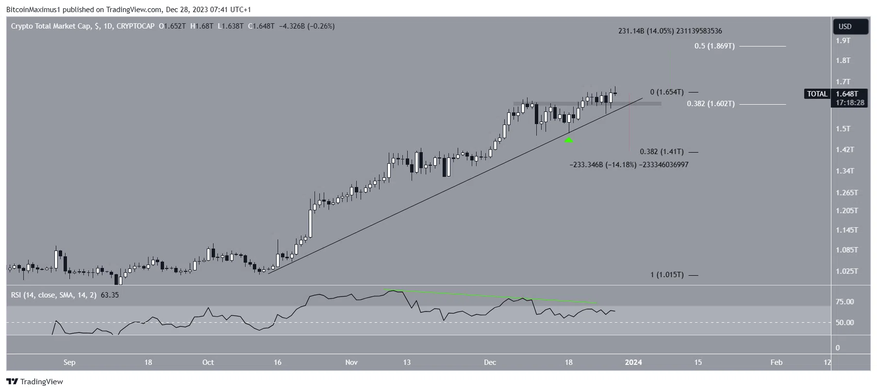 O TOTALCAP aumentou juntamente com uma linha de tendência de alta desde outubro. Mais recentemente, saltou na linha de tendência em 18 de dezembro (ícone verde) e iniciou um novo salto. Isso levou a uma nova máxima anual de US$ 1,68 trilhão nesta quinta-feira (28).