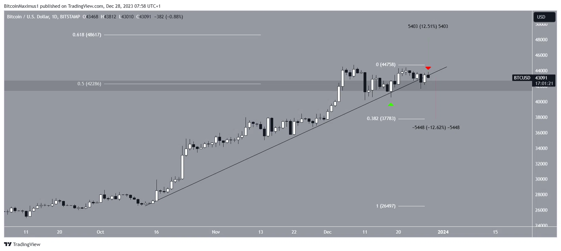 O preço rompeu a linha de tendência de alta em 26 de dezembro. Embora tenha saltado no dia seguinte, aparentemente está em queda atualmente (ícone vermelho). No entanto, o BTC ainda é negociado acima do nível de suporte de longo prazo de US$ 42.250.