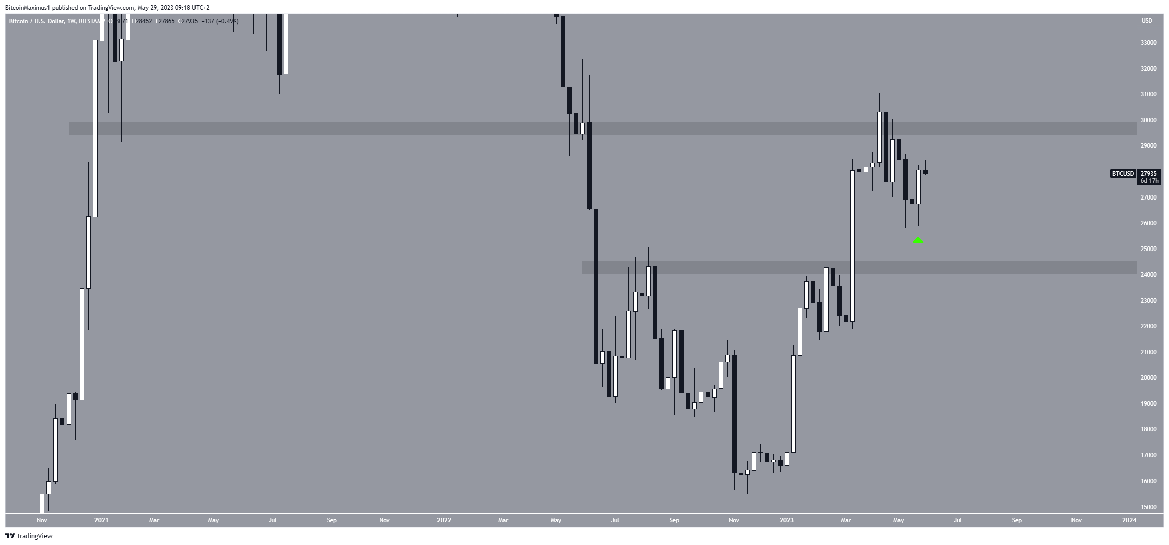 Da mesma forma, o preço do Bitcoin criou um candle de alta na semana passada (ícone verde), encerrando a queda iniciada em abril. No entanto, o preço ainda é negociado abaixo da área de resistência em US$ 29.800.