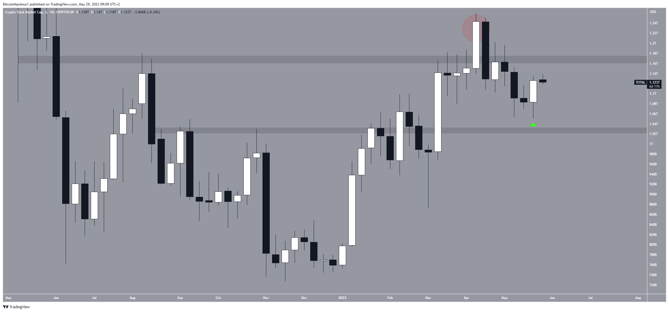 O movimento de queda levou a uma mínima de US$ 1,05 trilhão em 25 de maio. O preço saltou significativamente depois, criando um grande candle de alta (ícone verde).