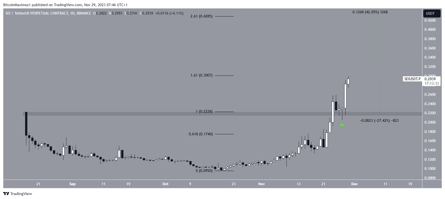 O SEI aumentou rapidamente desde o início de novembro. O preço rompeu a área de resistência horizontal de US$ 0,22 em 24 de novembro, validando-a como suporte três dias depois (ícone verde).
