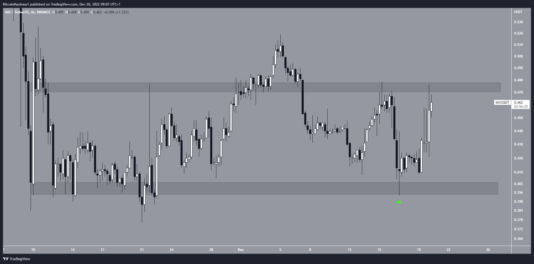 O preço do ImmutableX (IMX) está em alta desde que saltou na área de suporte horizontal de US$ 0,400 e criou um longo pavio inferior (ícone verde). O movimento levou a um topo de US$ 0,476 feito nas últimas 24 horas.