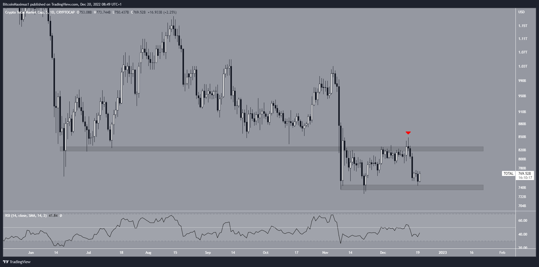 A capitalização do mercado de criptomoedas (TOTALCAP) está em alta desde 21 de novembro, atingindo um topo de US$ 848 bilhões em 14 de dezembro. No entanto, o valor de mercado voltou a cair, atingindo US$ 744 bilhões cinco dias depois. A queda validou a área de US$ 825 bilhões como resistência.