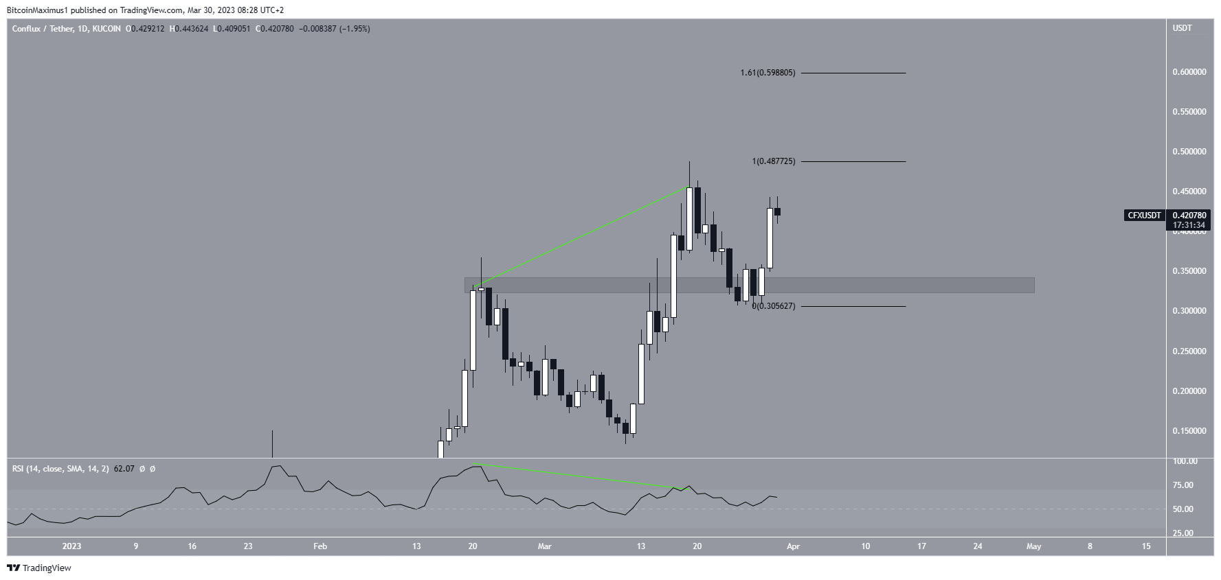 O preço do CFX caiu desde que atingiu uma nova máxima anual de US$ 0,487 em 19 de março. A queda foi precedida por uma divergência de baixa no RSI diário.