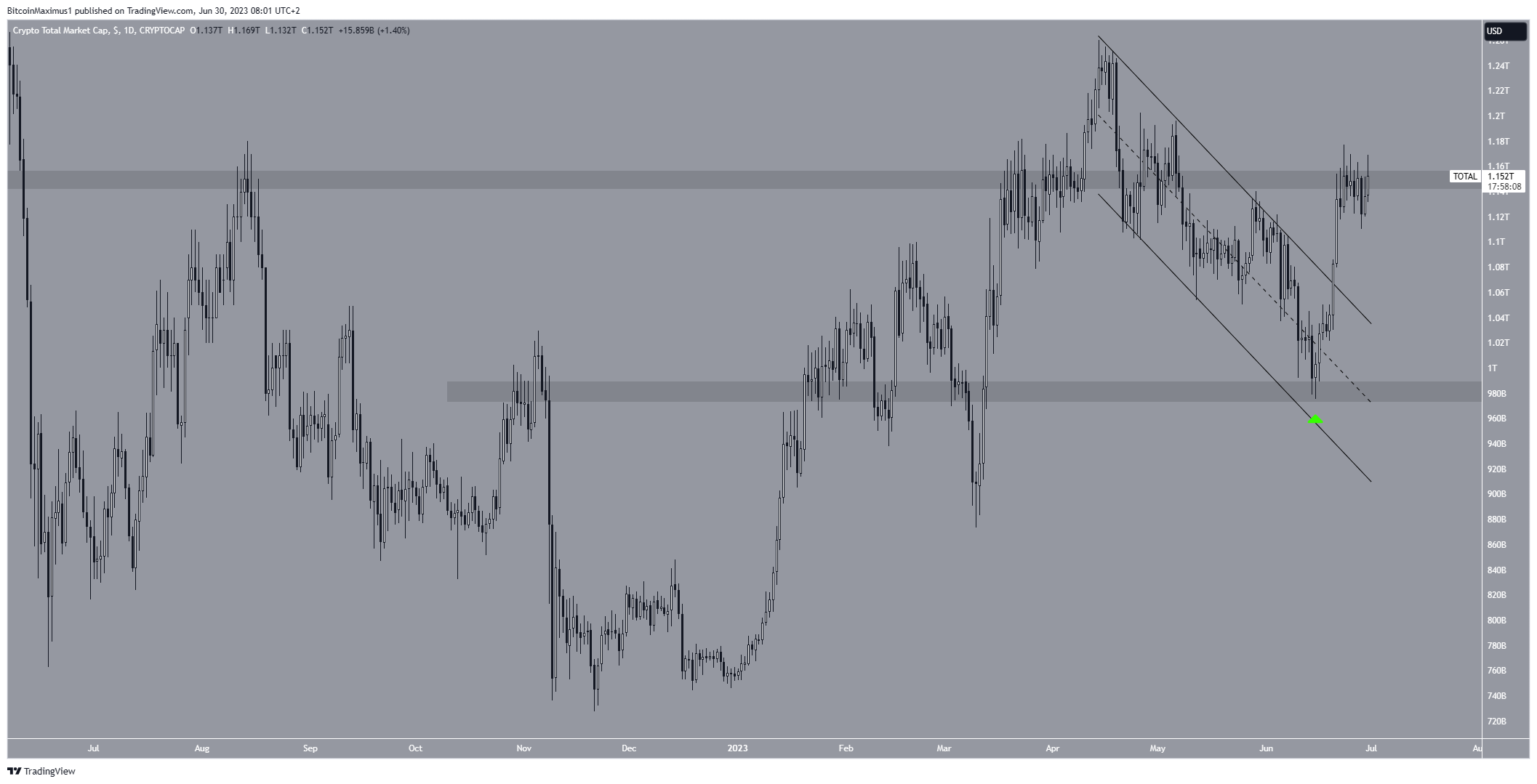Em 15 de junho, houve uma recuperação notável, o que confirmou que o nível de suporte de US$ 980 bilhões é confiável. Demorou cinco dias para o TOTALCAP mover-se acima de um canal paralelo de baixa, resultando numa máxima de US$ 1,17 trilhão em 23 de junho.