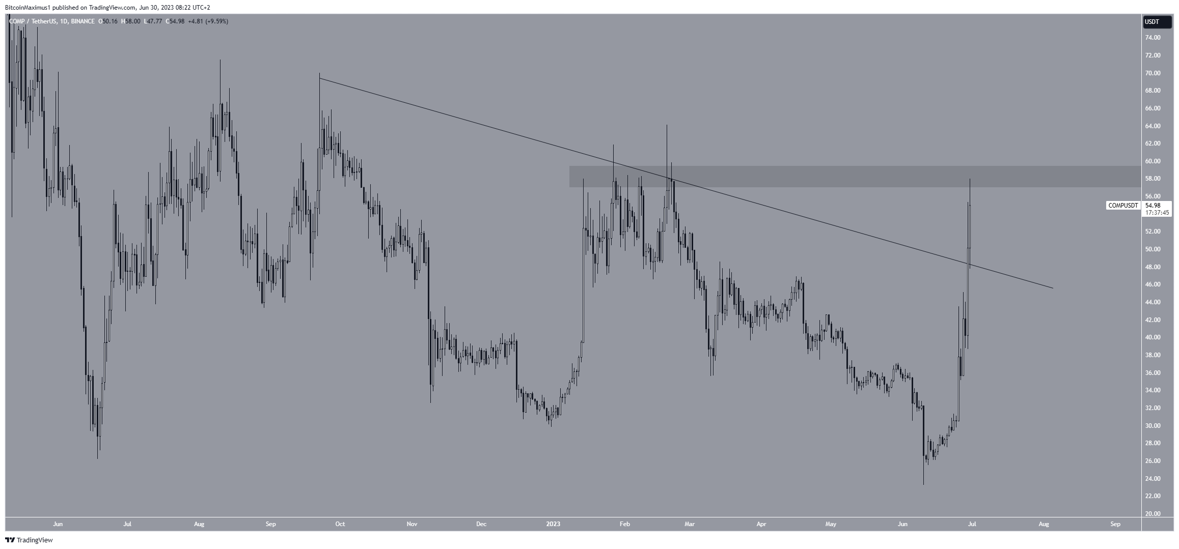 O COMP está em alta desde 10 de junho, subindo 150% no processo. Em 29 de junho, o preço saiu de uma linha de tendência de baixa. Agora está se aproximando de sua máxima anual de US$ 58.