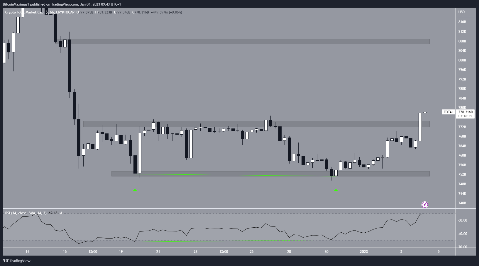 O TOTALCAP criou um padrão de fundo duplo (ícones verdes) dentro da área de suporte de US$ 752 bilhões entre 18 e 30 de dezembro. O fundo duplo é considerado um padrão de alta, o que significa que leva a saltos na maioria das vezes.