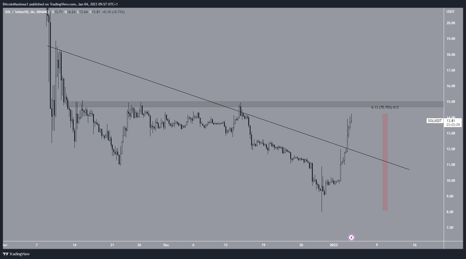 O preço da SOL caiu abaixo de uma linha de tendência de baixa em 9 de novembro. A queda levou a uma mínima de US$ 8 feita em 29 de dezembro.