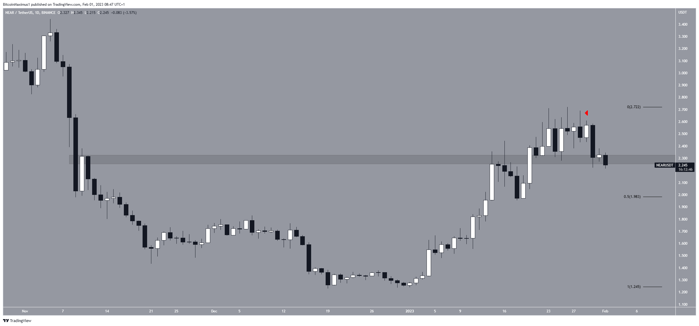 Atualmente, o preço da NEAR corre o risco de cair da área de suporte horizontal de US$ 2,29. Se fizer isso, pode atingir o nível de retração de 0,5 de Fibonacci em US$ 1,98. Por outro lado, um movimento acima das máximas de US$ 2,72 poderia levar o preço para US$ 3,35.
