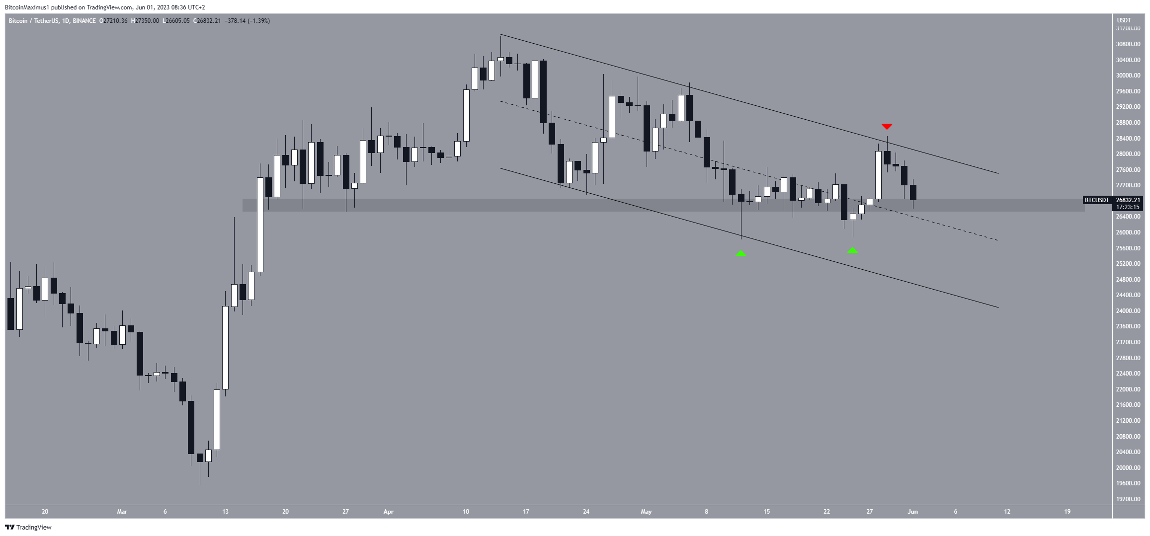 O preço do Bitcoin foi rejeitado pela linha de resistência de um canal paralelo de baixa. Posteriormente, a queda acelerou em 31 de maio. O preço então atingiu a área de suporte horizontal de US$ 26.700 no dia seguinte e atualmente está negociado dentro dela.