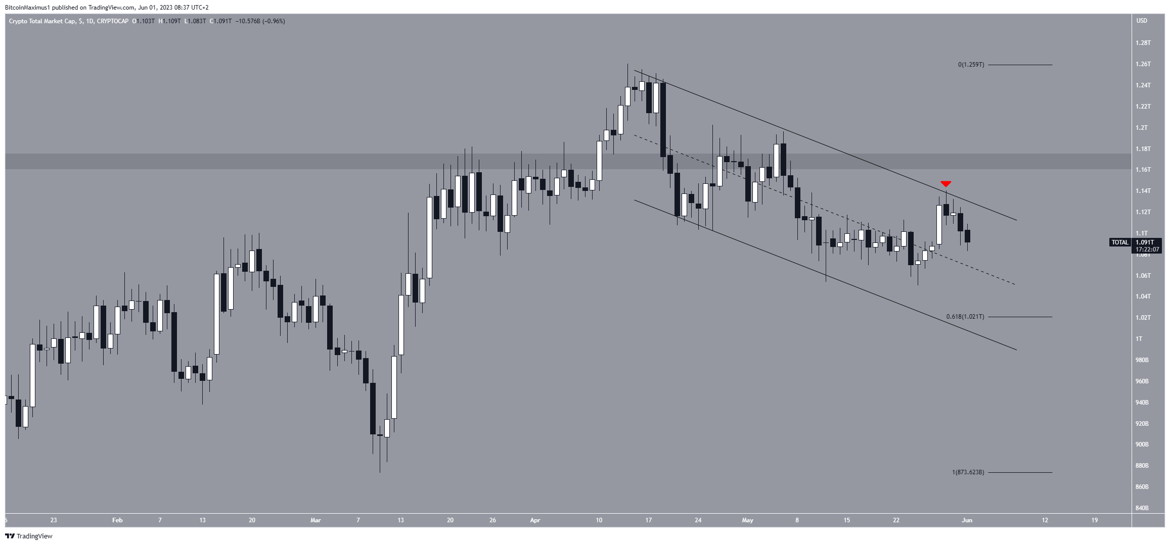 O TOTALCAP caiu desde que desviou acima da área de resistência de US$ 1,17 trilhão em 14 de abril. A queda assumiu a forma de um canal paralelo de baixa, que é considerado um padrão de alta. Como resultado, é provável que o preço saia dele.