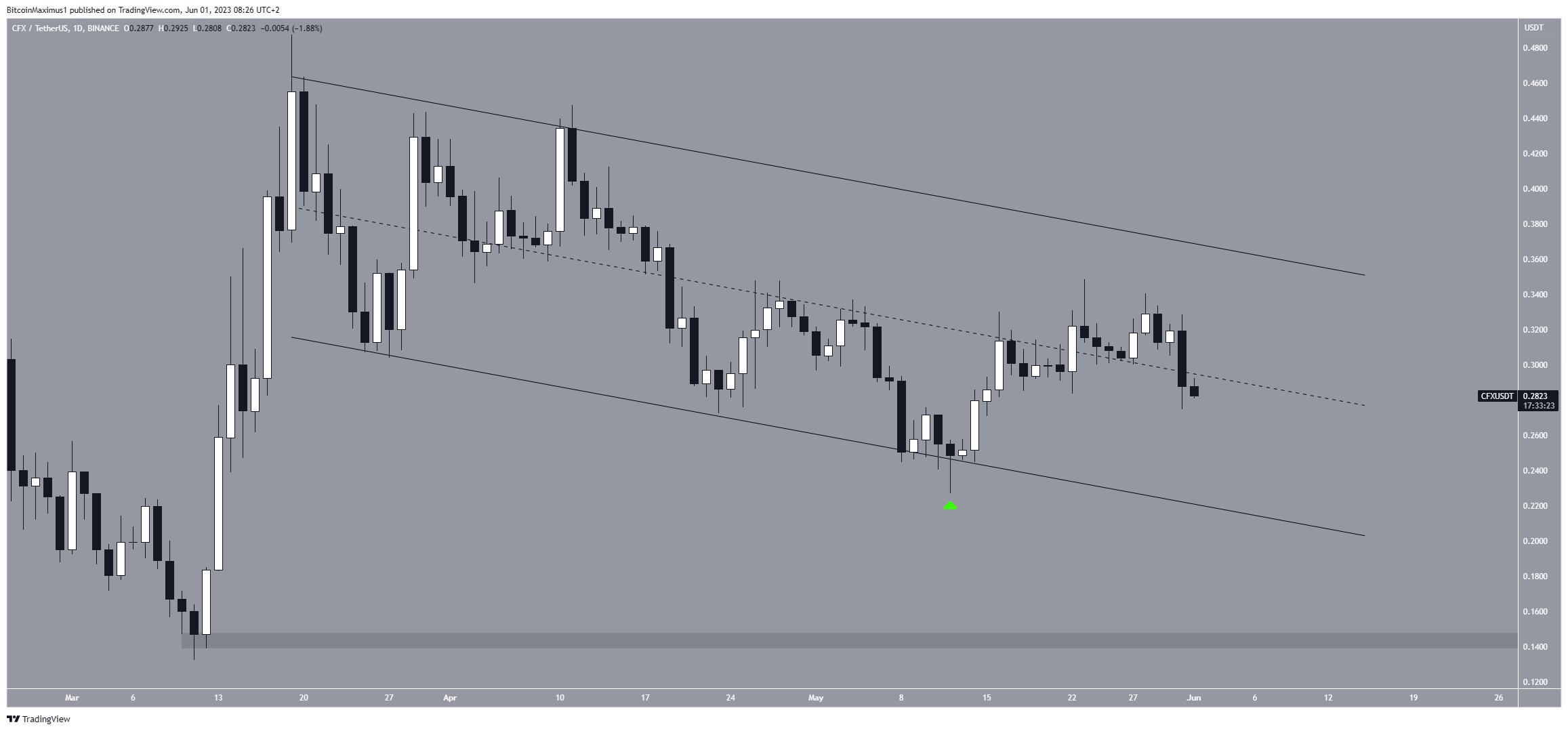 O preço do CFX caiu dentro de um canal paralelo de baixa desde 19 de março. Mais recentemente, saltou na linha de suporte do canal em 12 de maio (ícone verde).