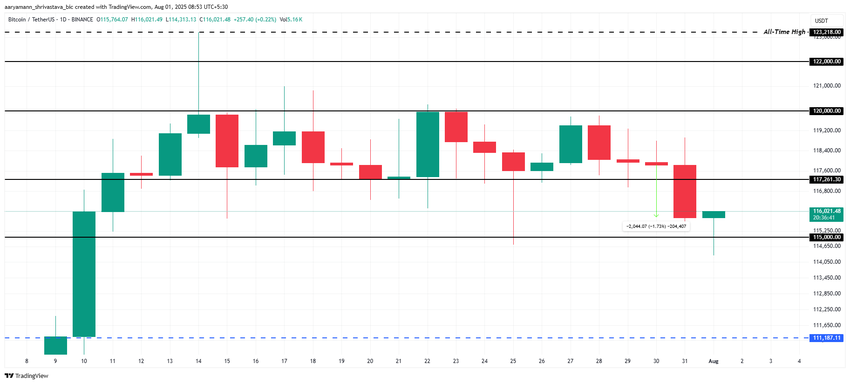 O preço do Bitcoin está atualmente em US$ 116.021, apresentando queda após cair da faixa de consolidação de duas semanas entre US$ 117.261 e US$ 120 mil. A queda atual no preço indica incerteza no mercado, com o Bitcoin não conseguindo se manter acima dos níveis de suporte recentes, abrindo espaço para potenciais novas quedas.