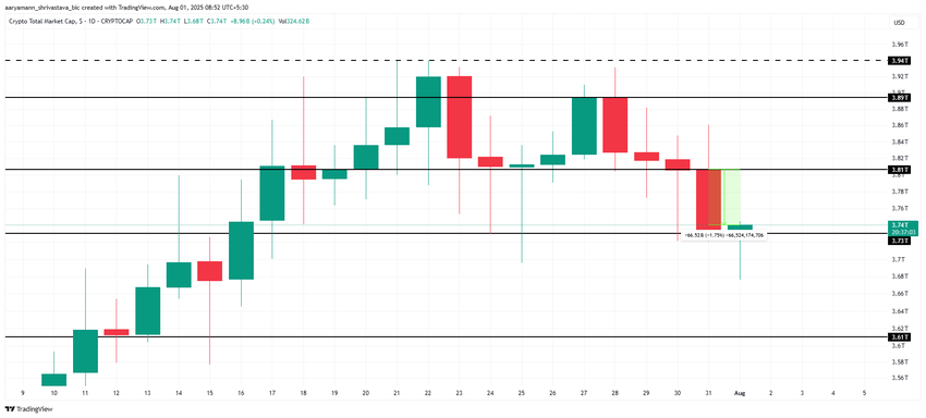 O valor total do mercado de criptomoedas caiu US$ 66 bilhões, atingindo US$ 3,74 trilhões. Apesar da queda recente, o mercado permanece acima do nível de suporte crítico de US$ 3,73 trilhões. Esse suporte pode ajudar a estabilizar o mercado, dando-lhe o potencial de se recuperar em direção à resistência de US$ 3,81 trilhões.