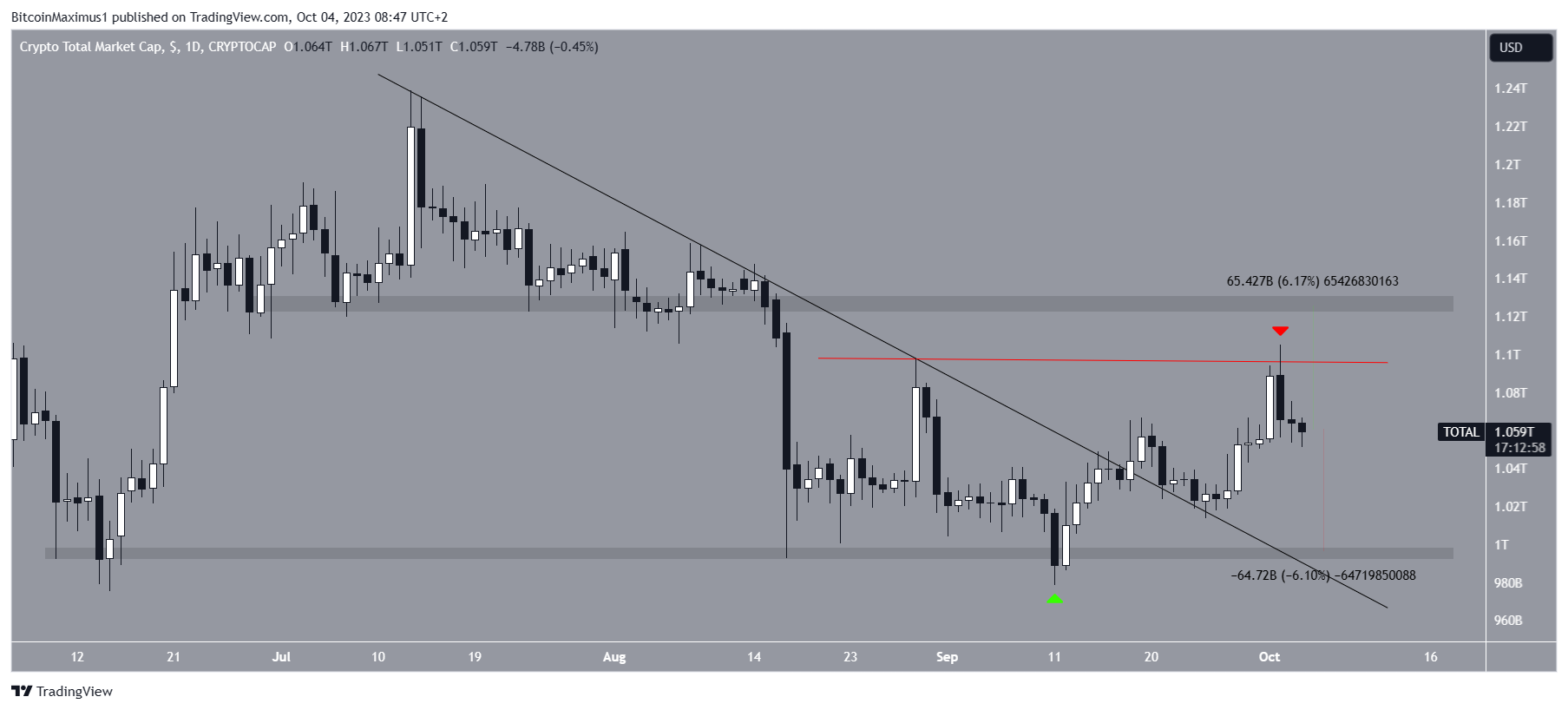 A capitalização total do mercado está em alta desde que saltou para a área de suporte horizontal de US$ 1 trilhão em 11 de setembro. O aumento causou o rompimento de uma linha de tendência de baixa em 18 de setembro.
