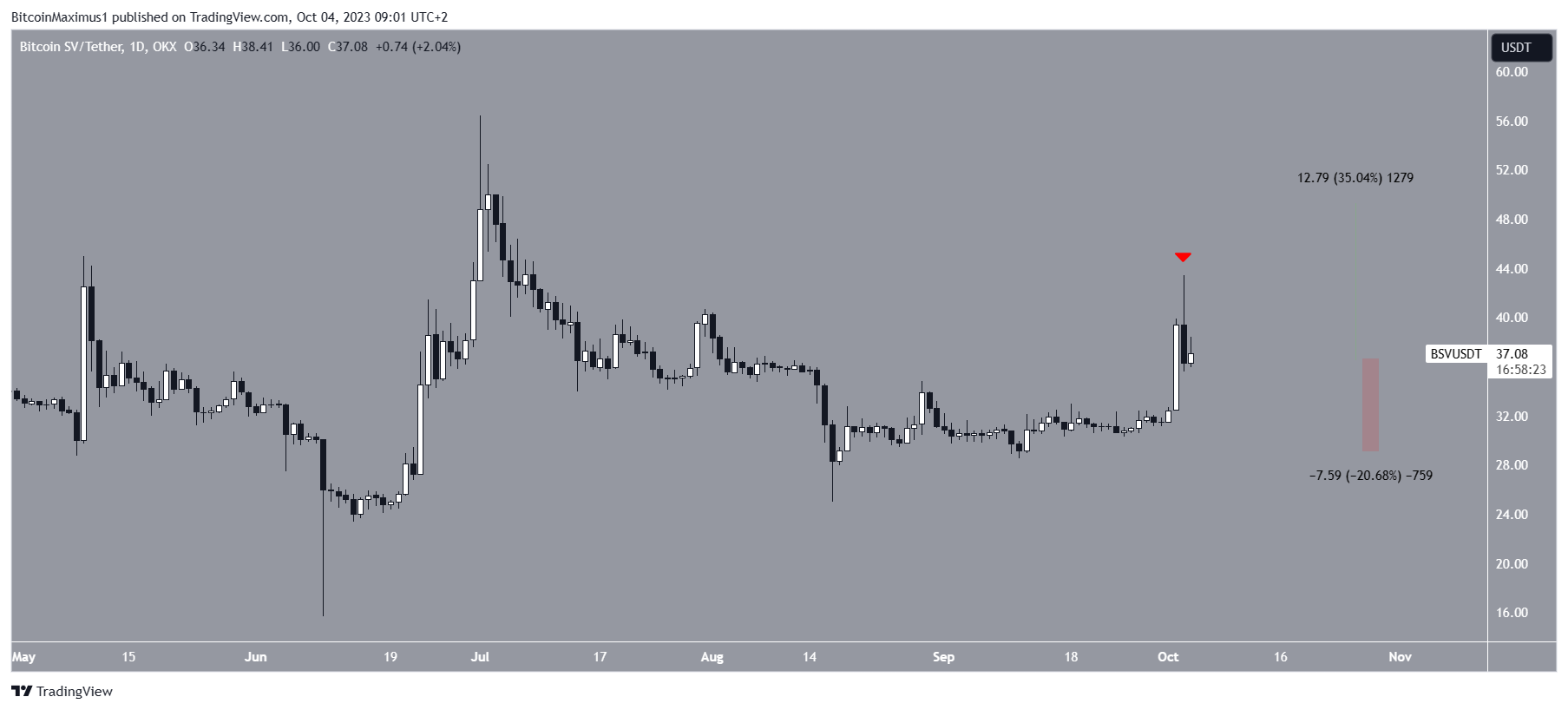 O preço do Bitcoin SV aumentou significativamente em 2 de outubro. Embora o aumento tenha continuado no dia seguinte, o preço não conseguiu sustentá-lo. Em vez disso, criou um candle de baixa com um longo pavio superior (ícone vermelho).