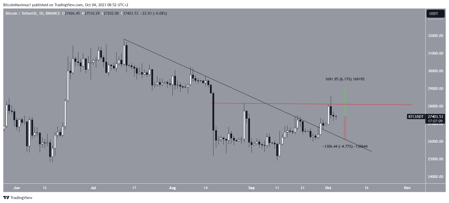 Da mesma forma que o TOTALCAP, o Bitcoin rompeu uma linha de tendência de baixa em 28 de setembro. O rompimento levou a uma alta de US$ 28.580 em 2 de outubro.