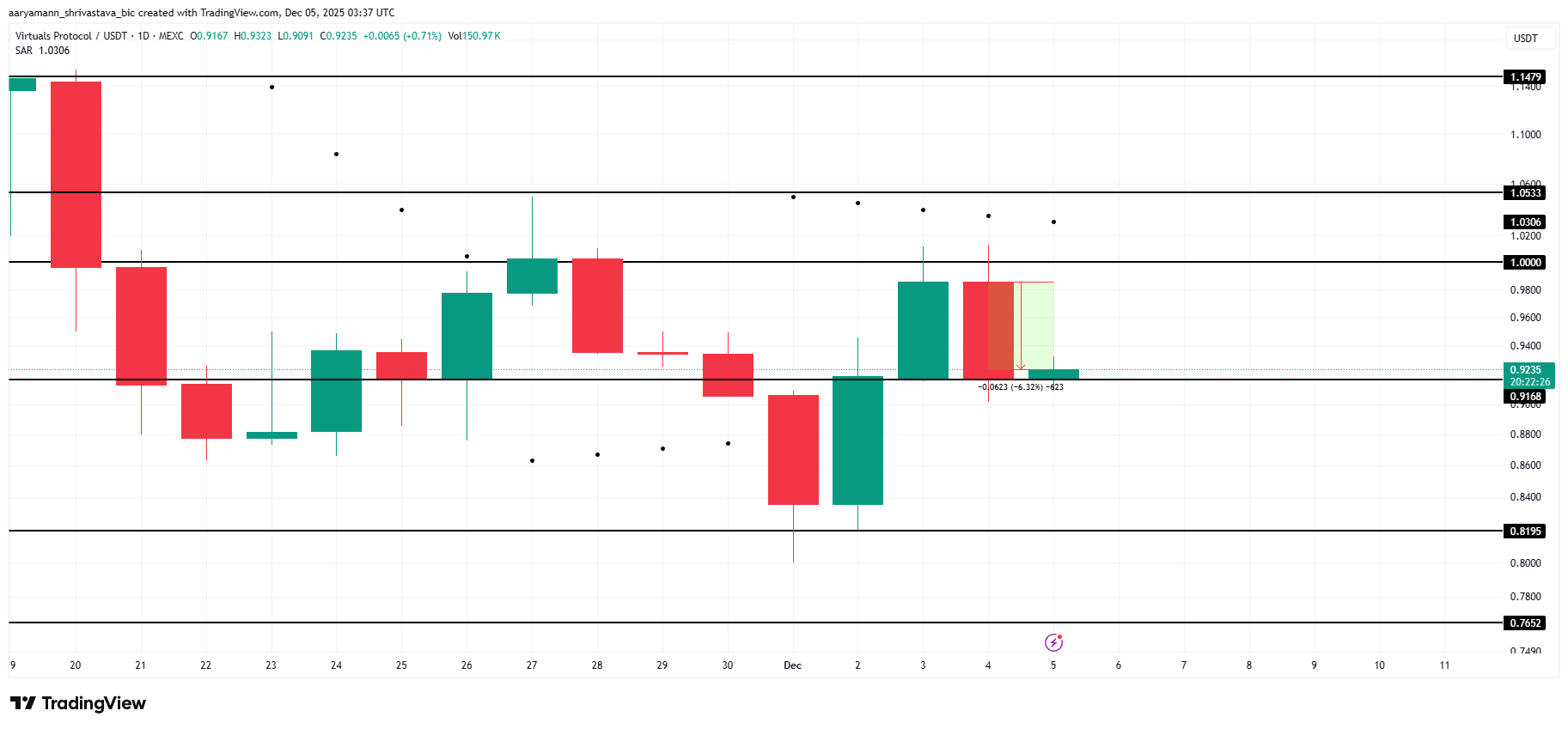 Caso o ímpeto de alta retorne, a VIRTUAL poderá se recuperar de US$ 0,916 e subir em direção à marca de US$ 1,00. Uma ruptura bem-sucedida acima dessa barreira psicológica invalidaria a tese de baixa e poderia impulsionar a altcoin para US$ 1,05.