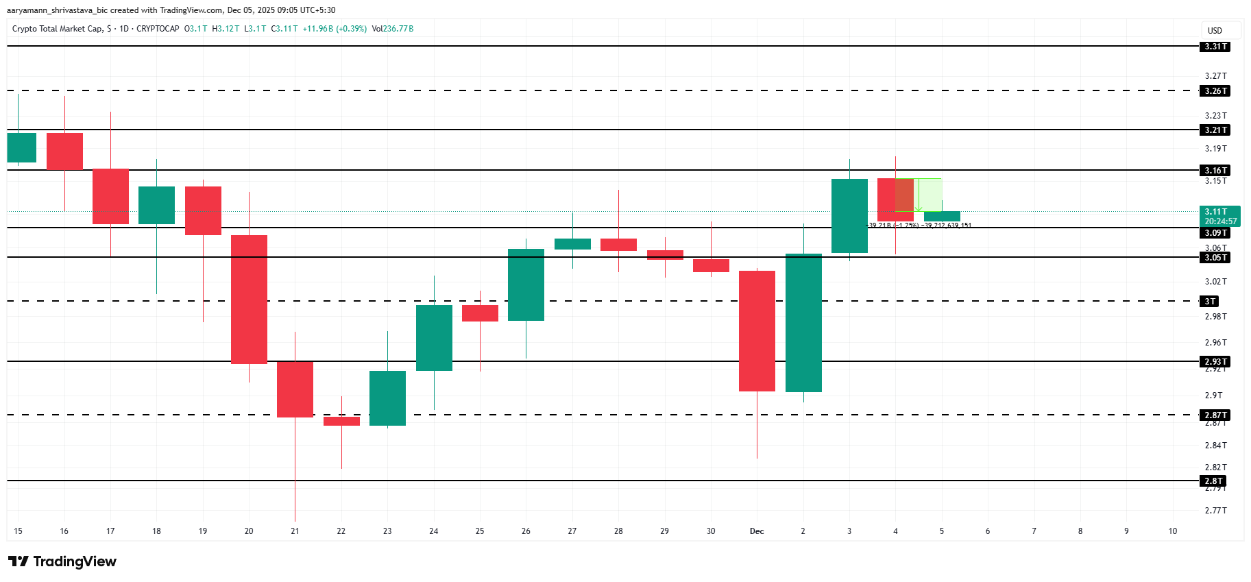 A capitalização total do mercado de criptomoedas caiu US$ 39 bilhões hoje, situando-se agora em US$ 3,11 trilhões, embora se mantenha acima do nível de suporte de US$ 3,09 trilhões. Essa zona permanece crucial para a manutenção da estabilidade no curto prazo, enquanto os investidores reavaliam o sentimento após a última correção.