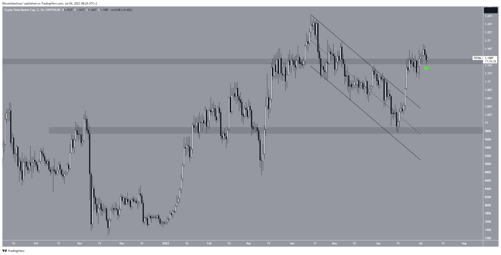 O TOTALCAP experimentou um movimento de alta desde que encontrou suporte em torno da marca de US$ 980 bilhões em 15 de junho. Posteriormente, rompeu um canal paralelo de baixa cinco dias depois.