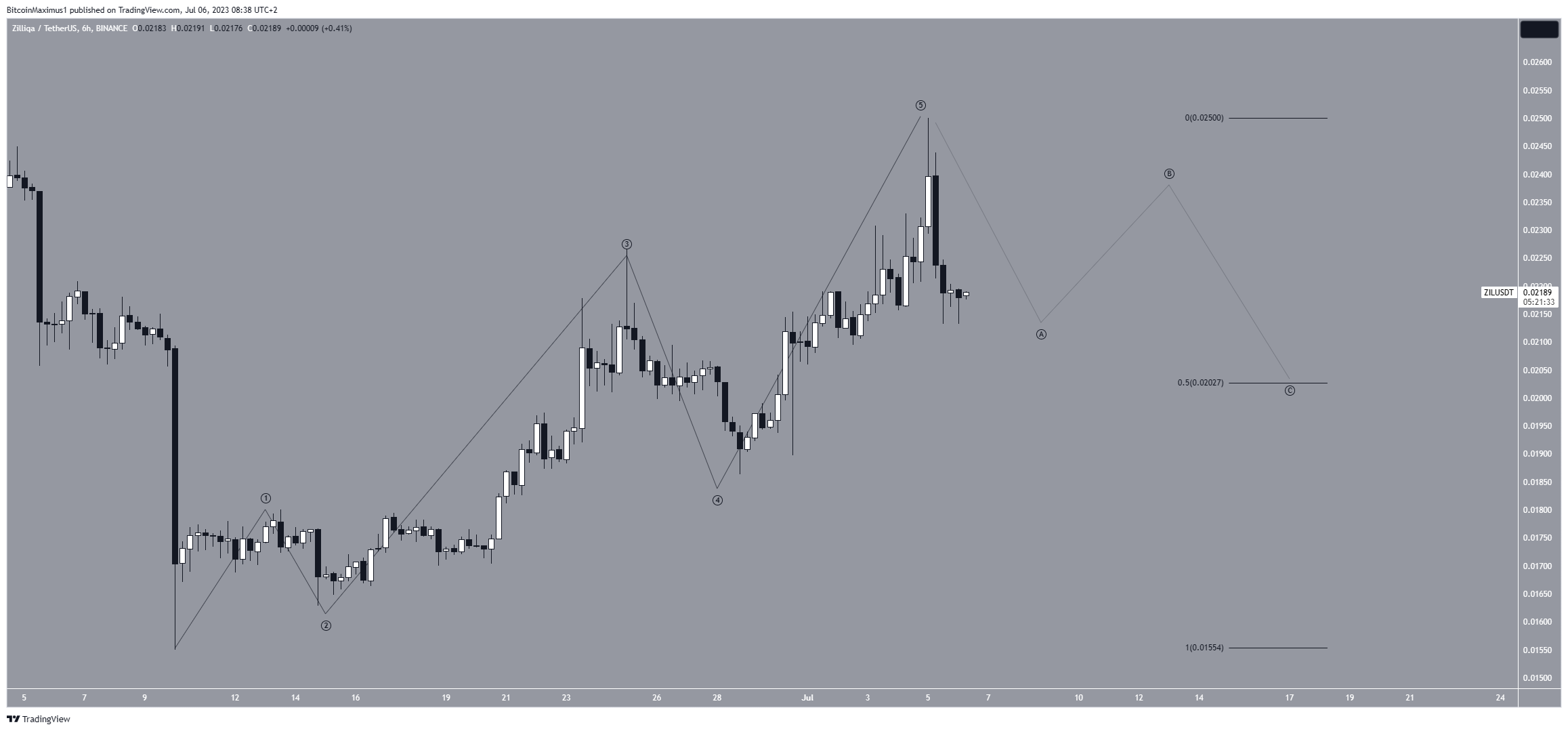 A partir de 10 de junho, a ZIL completou um movimento de alta de cinco ondas (preto), culminando com um topo em US$ 0,025 em 5 de julho. No entanto, o preço caiu desde então, atingindo uma mínima de US$ 0,021 no dia seguinte.