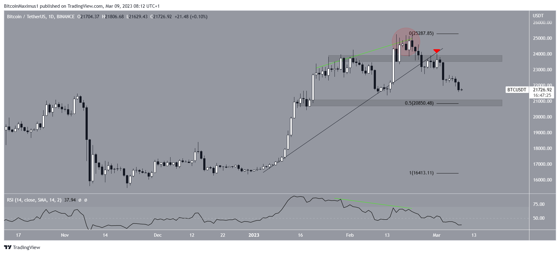 O preço do Bitcoin caiu abaixo de uma linha de tendência de alta em 24 de fevereiro e a validou como resistência em 1º de março (ícone vermelho). Ao fazer isso, também validou a área US$ 23.800 como resistência.