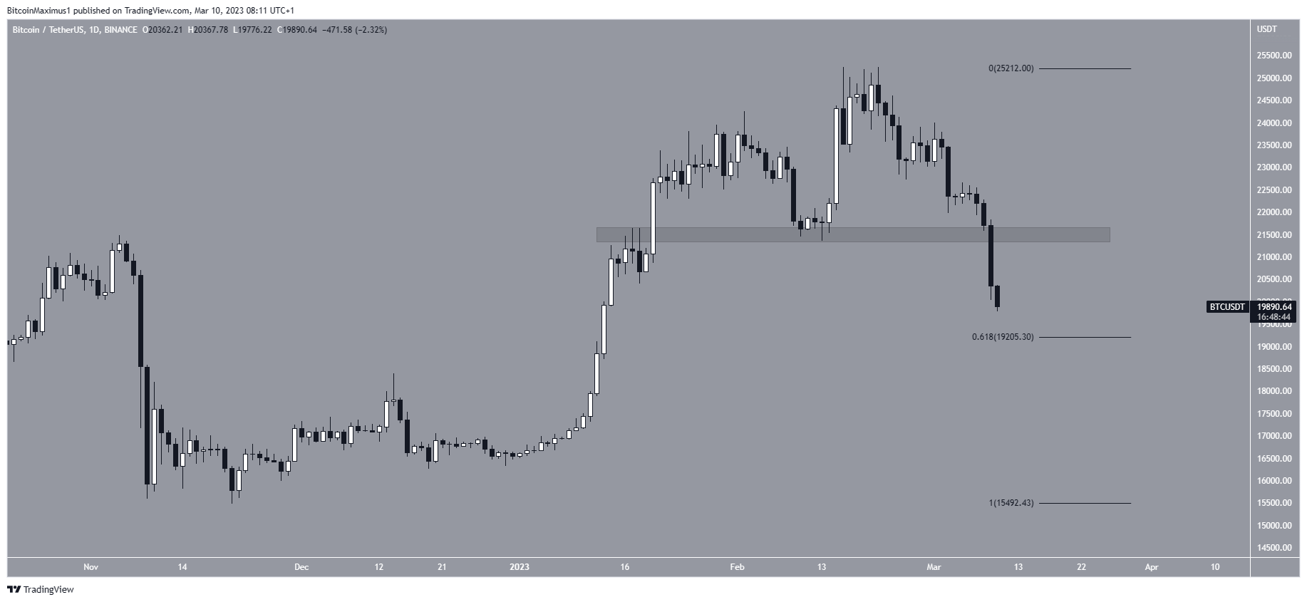 O preço do Bitcoin está em queda desde que atingiu uma alta de US$ 25.250 em 21 de fevereiro. Nas últimas 24 horas, a queda causou a perca da área de suporte horizontal de US$ 21.500.