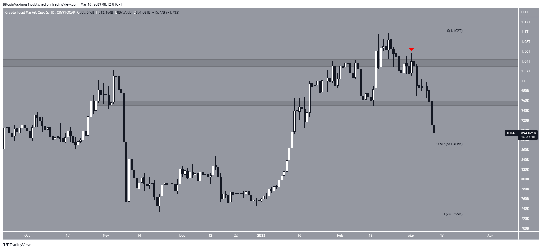 O valor total do mercado de criptomoedas diminuiu desde que se desviou acima da área de resistência de US$ 1,04 trilhão em 21 de fevereiro. Posteriormente, validou a mesma área como resistência em 1º de março (ícone vermelho).