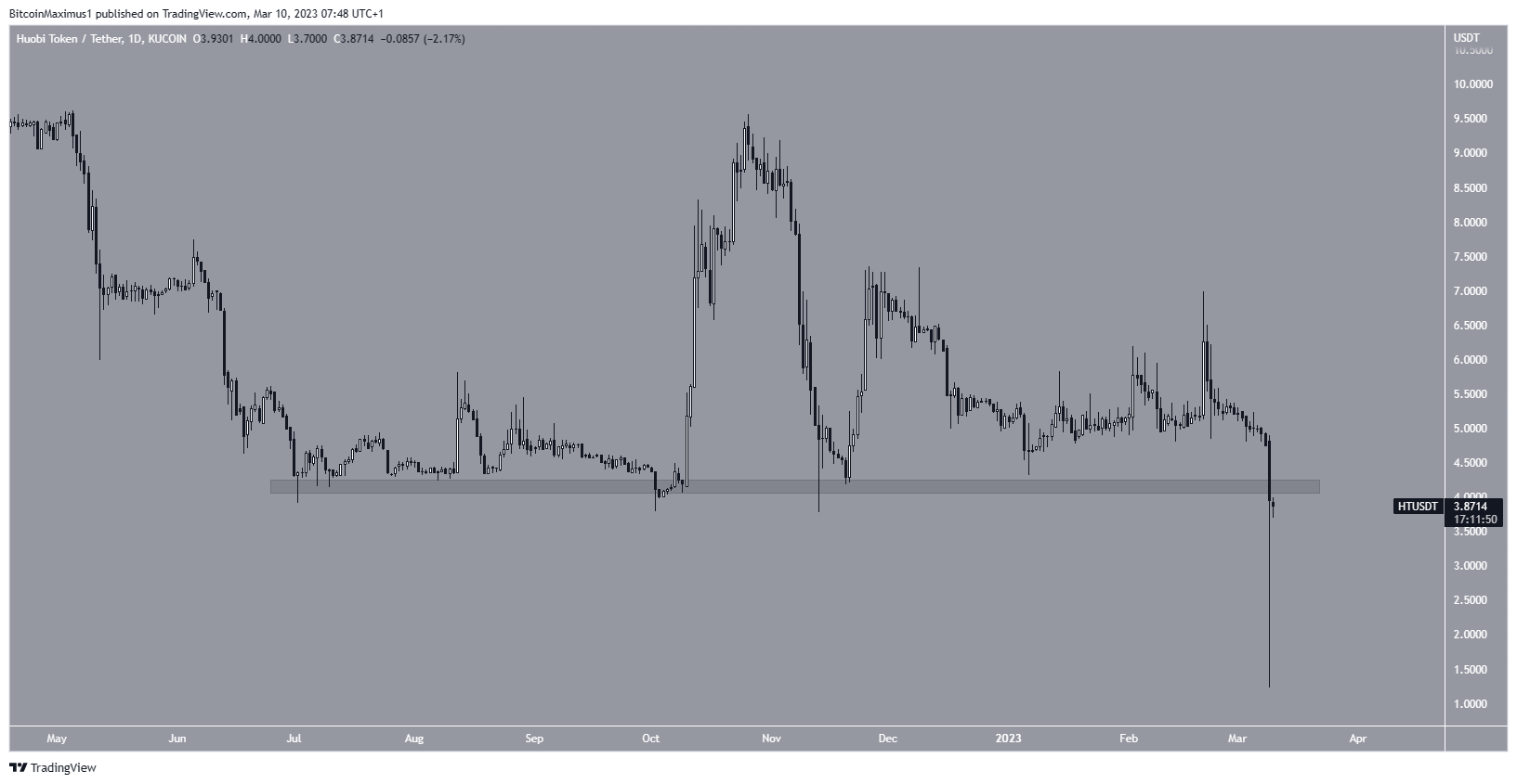 O preço do Huobi Token (HT) estava negociado acima da área de suporte horizontal de US$ 4 desde junho de 2022. A área iniciou vários saltos, o mais recente em novembro.