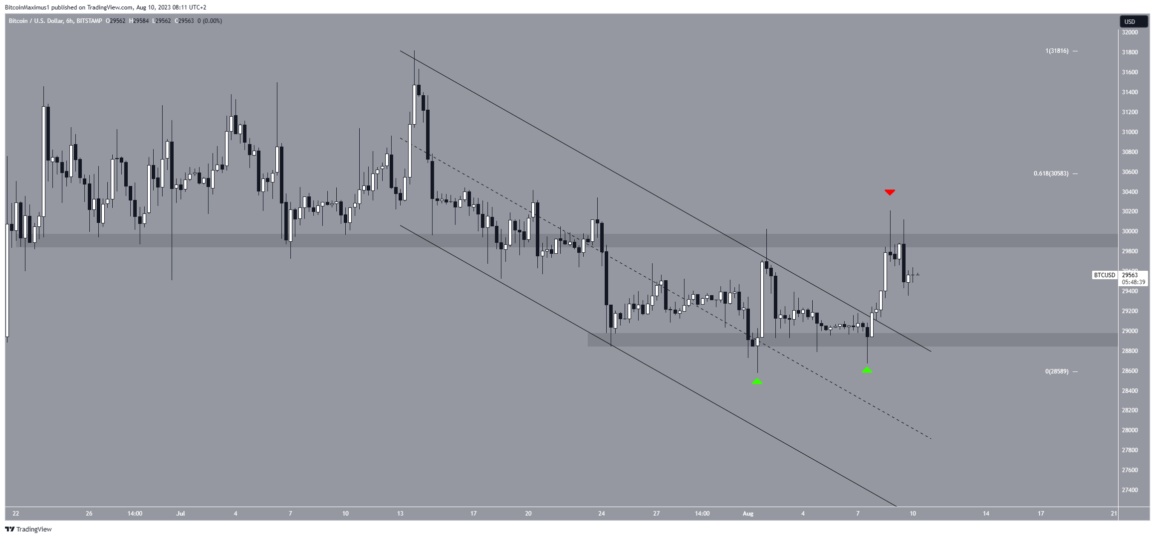 SponsoredNo entanto, o preço saltou duas vezes depois, criando fundos mais altos (ícone verde) e validando a área de US$ 28.800 como suporte. Depois, saiu do canal paralelo em 8 de agosto.