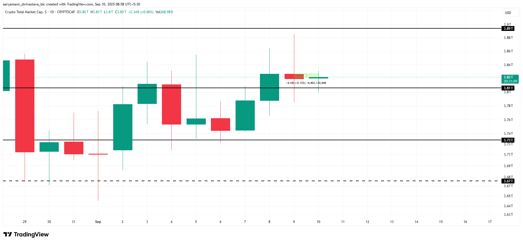 Olhando para o futuro, o TOTAL pode se recuperar do suporte de US$ 3,81 trilhões e tentar se mover em direção à resistência de US$ 3,89 trilhões. Tal alta seria crucial para investidores em criptomoedas, pois poderia acelerar a recuperação, restaurar o otimismo e potencialmente desencadear entradas mais fortes.
