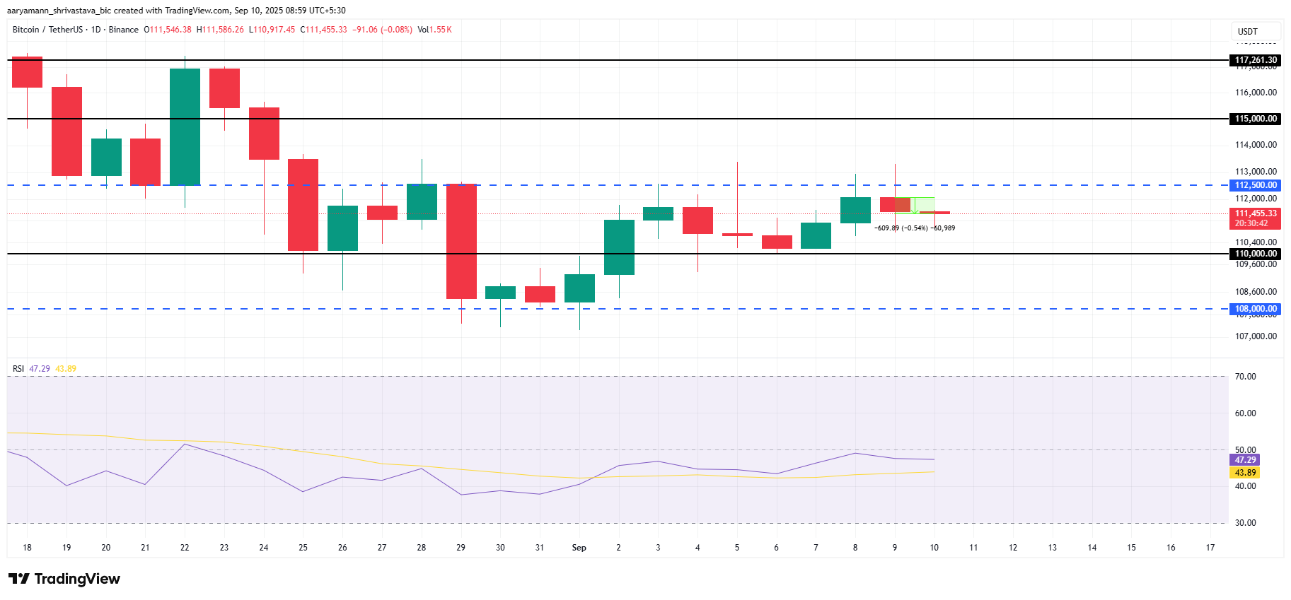 O RSI , no entanto, não sinaliza força imediata. O indicador está abaixo da marca neutra de 50,0, preso na zona negativa. Essa fraqueza sugere que o Bitcoin provavelmente permanecerá preso entre US$ 112.500 e US$ 110 mil, adiando quaisquer potenciais tentativas de rompimento no curto prazo.