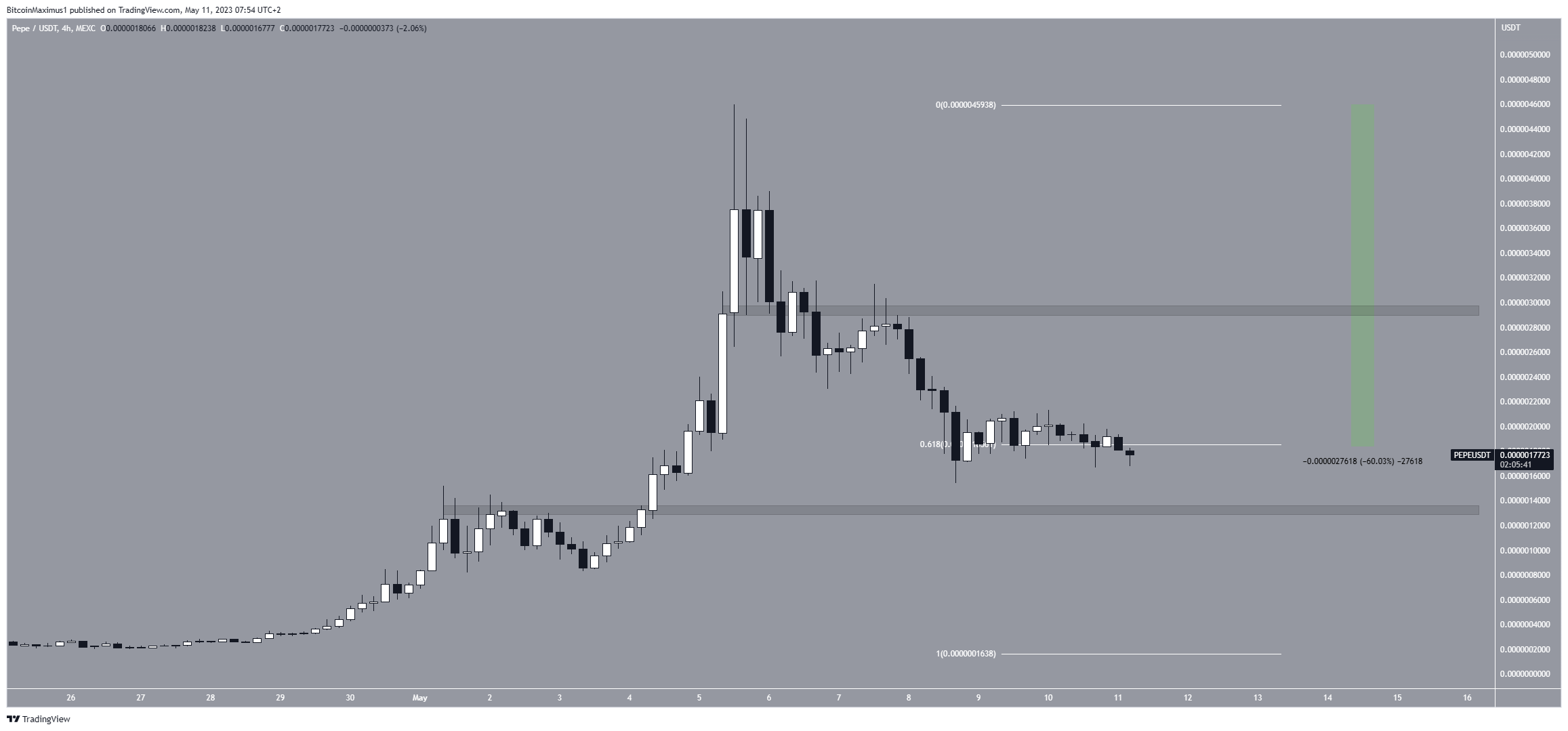 Depois de uma grande alta em abril e maio, o preço do PEPE finalmente atingiu o topo local em 5 de maio. Ele caiu desde então, culminando com um preço mínimo de US$ 0,0000015 em 8 de maio, uma queda de 60% em relação à alta.