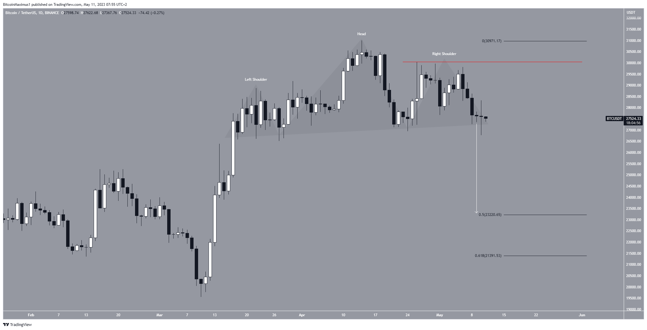 Desde 17 de março, o Bitcoin segue um padrão de ombro-cabeça-ombro, que frequentemente leva a quedas de preço.