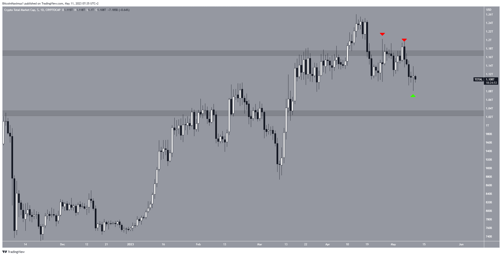 O TOTALCAP está em tendência de baixa desde 14 de abril, caindo abaixo da área de US$ 1,16 trilhão após seis dias. Em seguida, validou a área como resistência duas vezes, em 26 de abril e 6 de maio, respectivamente (ícones vermelhos).