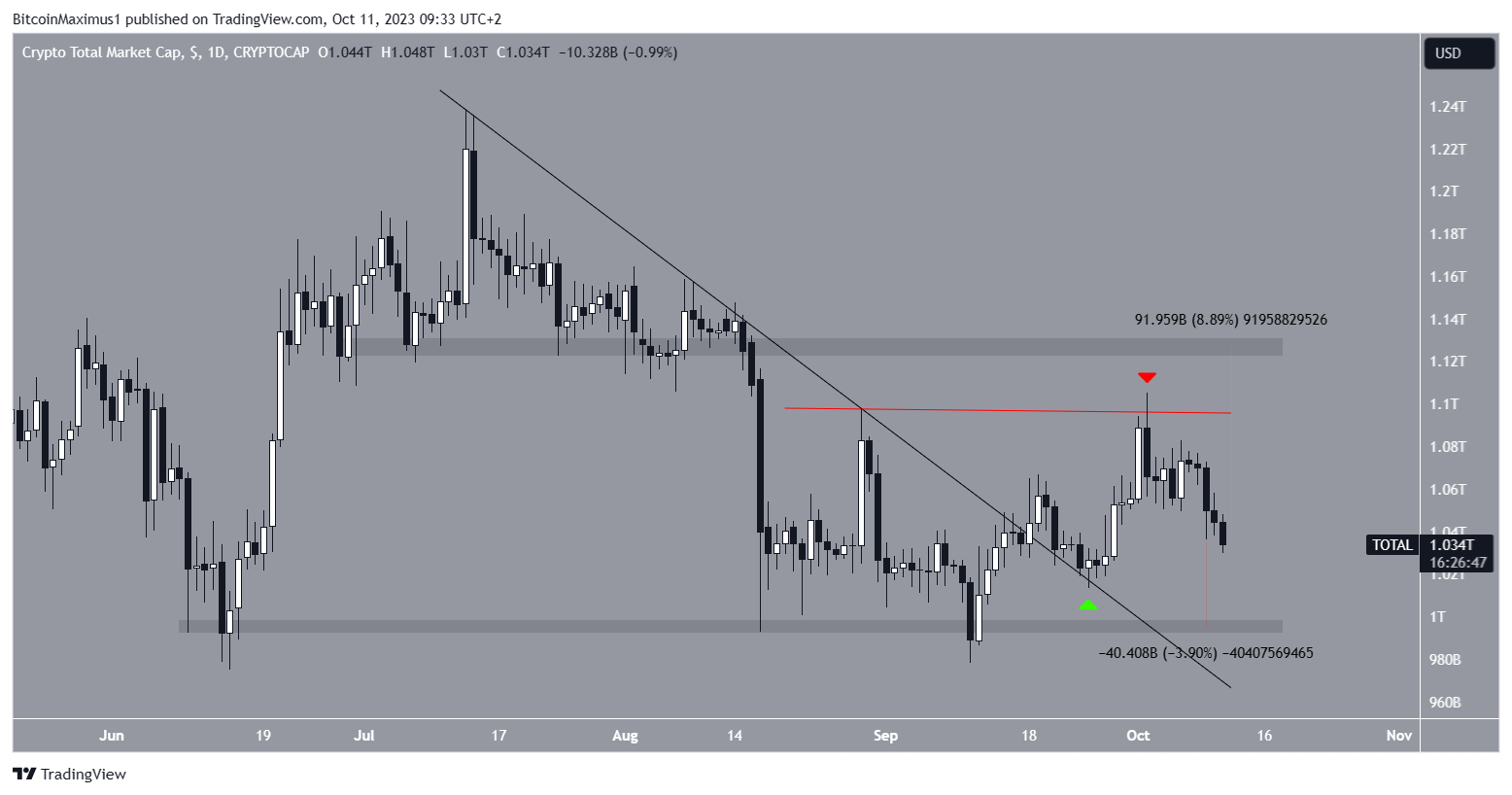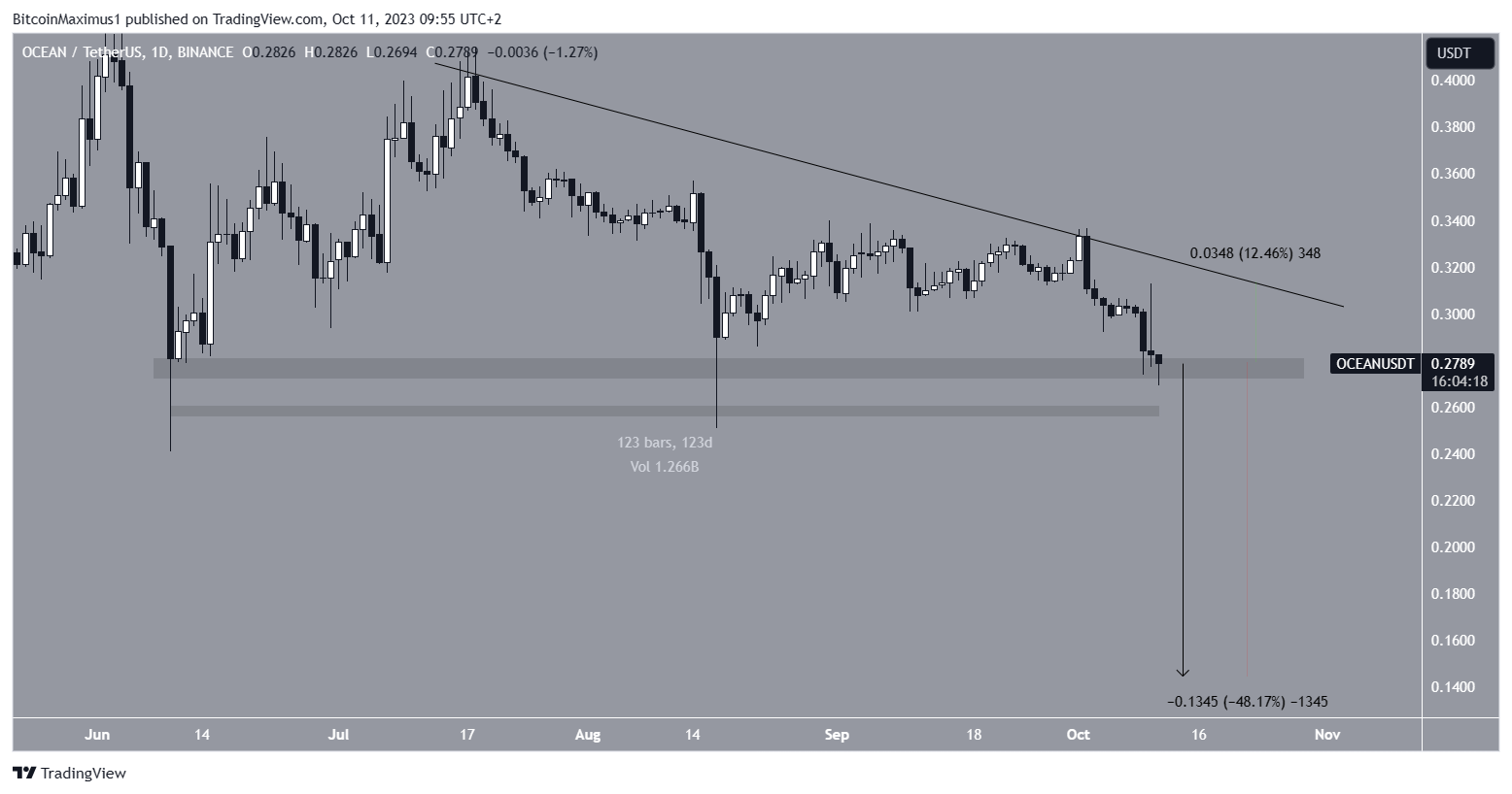 A capitalização total do mercado de criptomoedas (TOTALCAP) e o Bitcoin (BTC) estão em queda desde 2 de outubro. Enquanto isso, o Ocean Protocol (OCEAN) retornou a uma área de suporte horizontal de 120 dias.