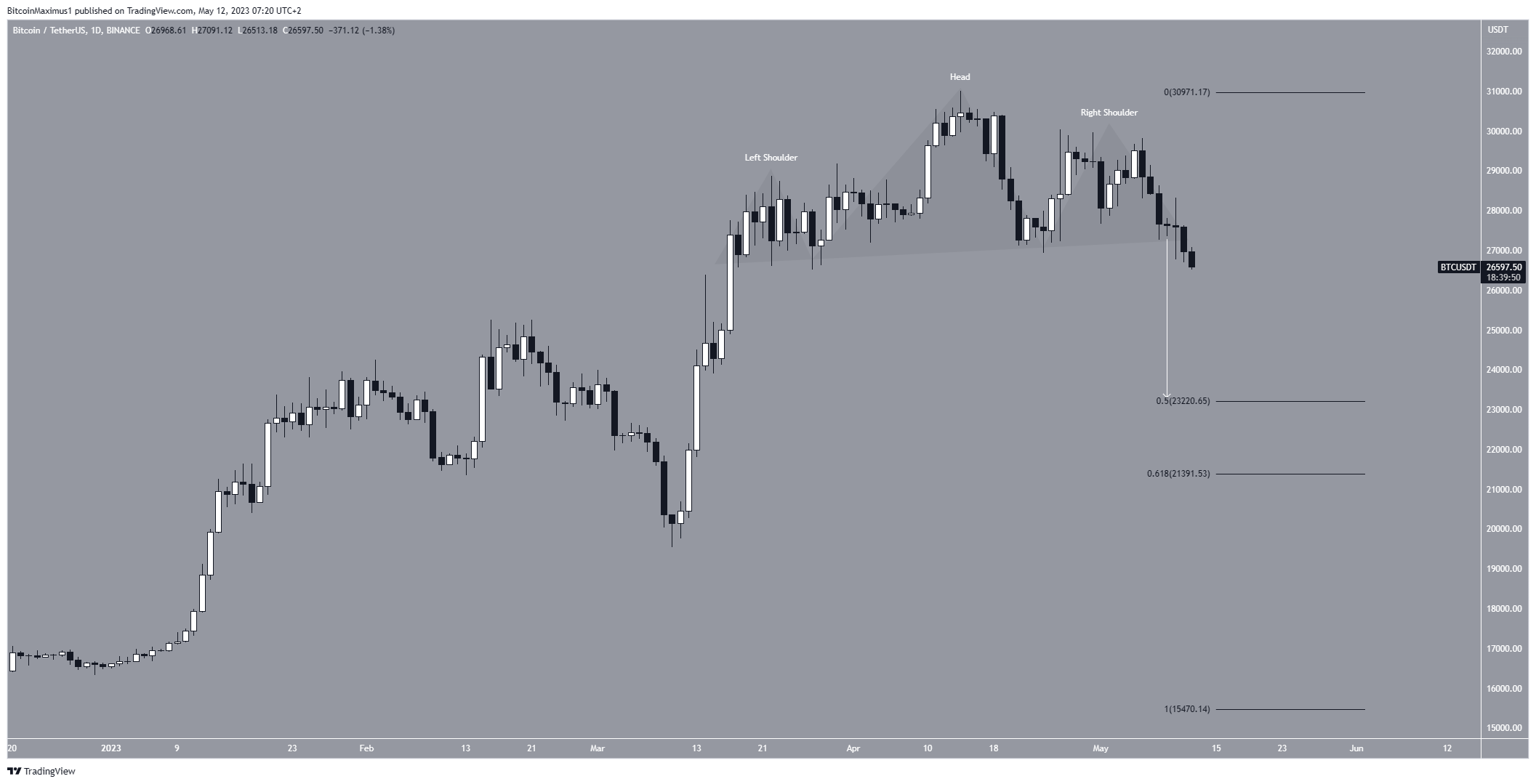 Desde 17 de março, o preço do Bitcoin segue um padrão de ombro-cabeça-ombro, que frequentemente leva a rompimentos de baixa.