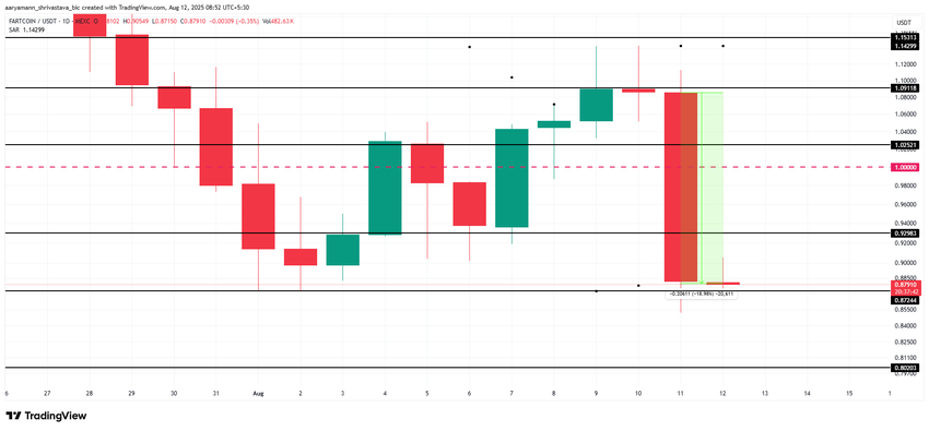 O preço da FARTCOIN sofreu uma queda significativa de 19% nas últimas 24 horas, tornando-se a memecoin com pior desempenho. A memecoin caiu abaixo da marca de US$ 1,00, sinalizando uma forte queda.