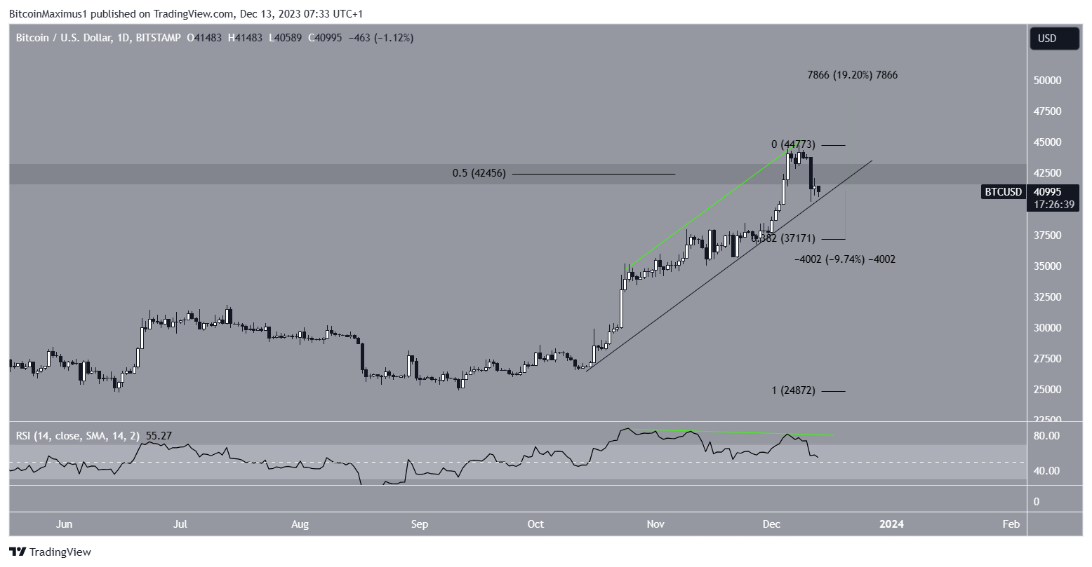 Se o BTC perder a linha de suporte ascendente, ele poderá cair 10% para o nível de retração 0,382 de Fibonacci, em US$ 37.200.