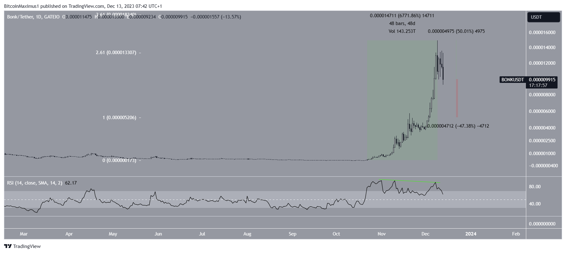 O BONK aumentou rapidamente desde outubro. Após um aumento de 67.000%, o preço atingiu um novo topo histórico de US$ 0,000015 em 9 de dezembro.